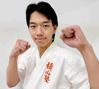 私は小学4年生の頃から悟心塾で空手を習い始め、小学4年生から中学3年生までは塾生として、心と体を強くしていきました。高校1年生からは指導員という立場で悟心塾と関わっており、塾生たちの心と体を強くするための稽古のサポートをしています。